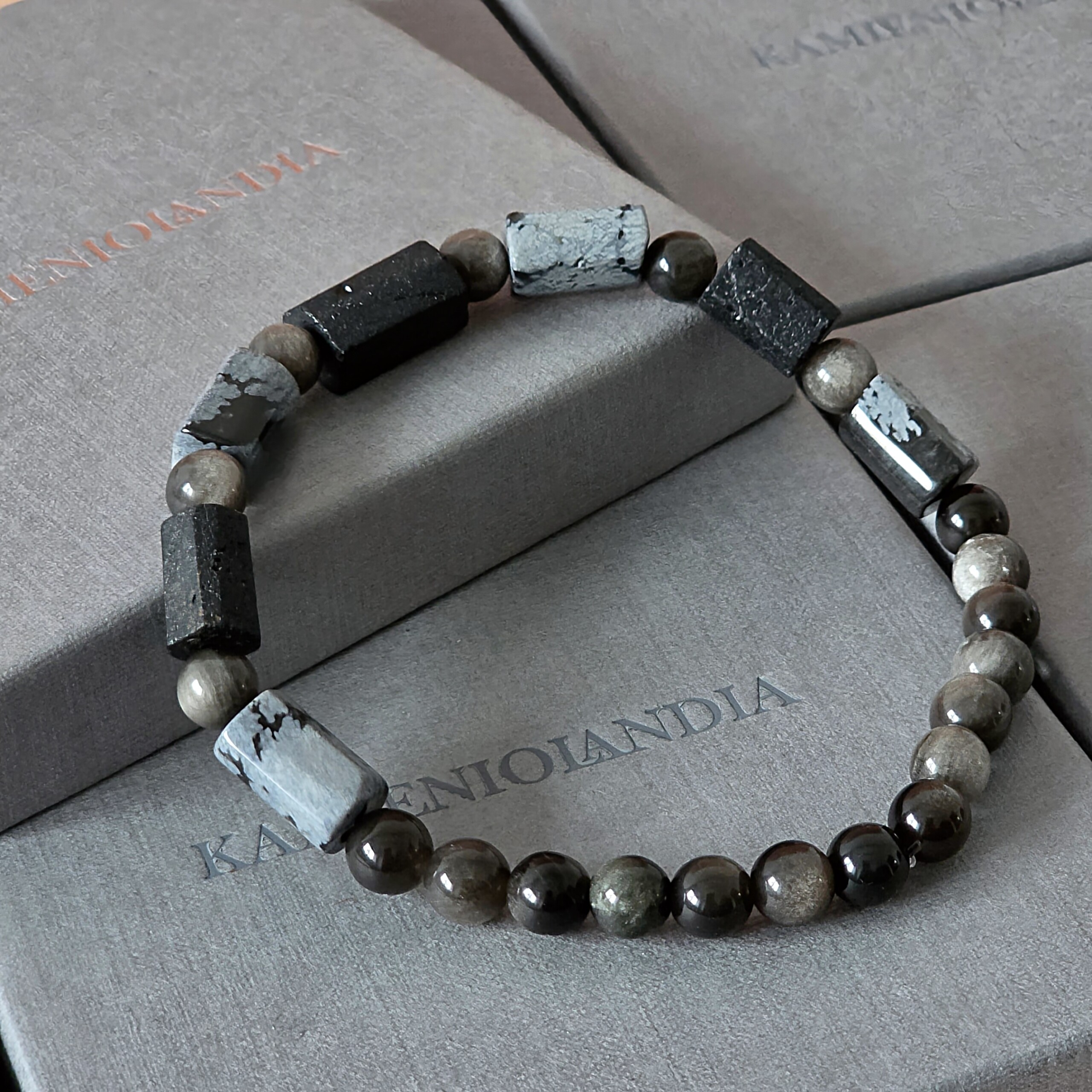 Bransoletka męska Turmalin, Obsydian śnieżny, Obsydian srebrzysty