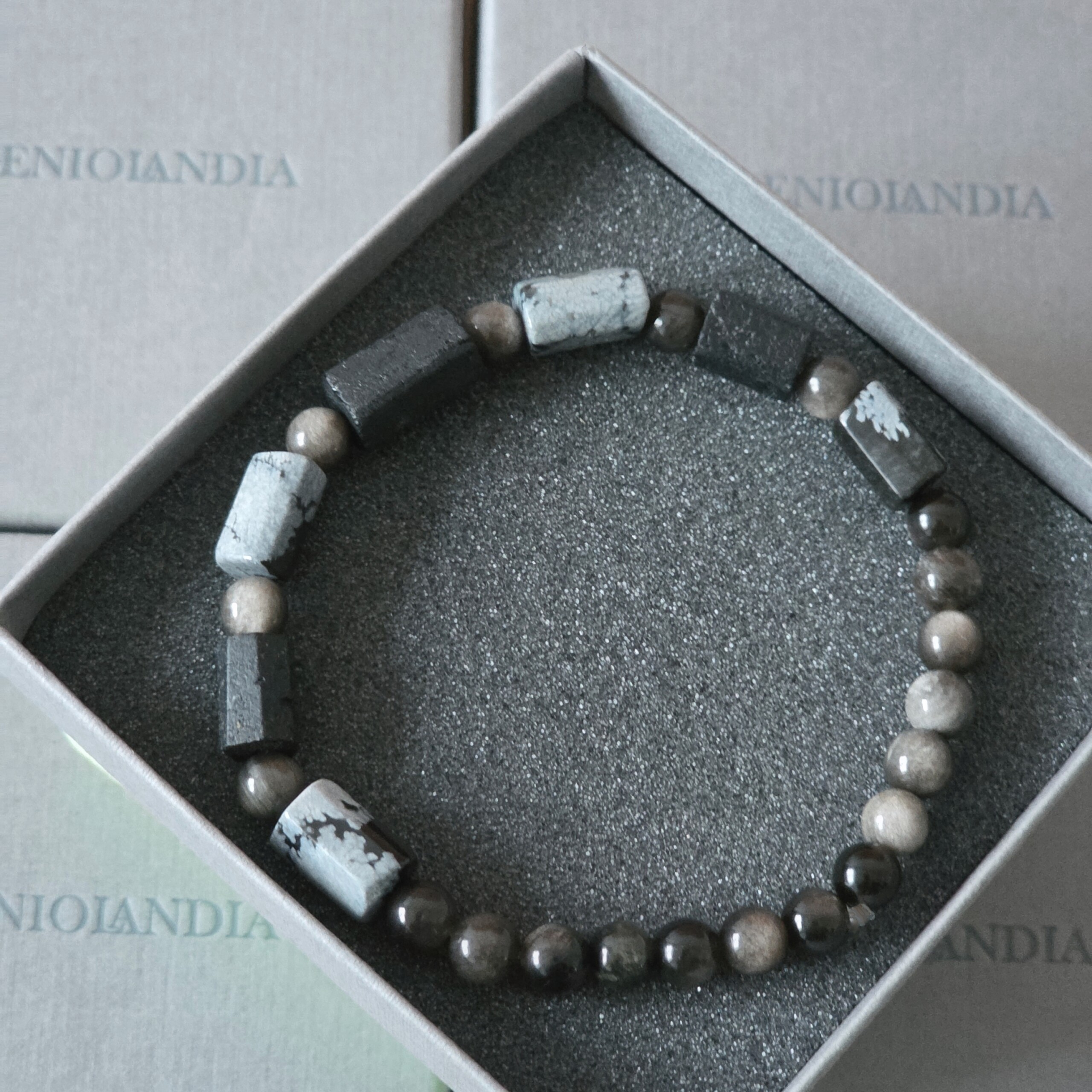 Kamienie użyte do wykonania bransoletki : TURMALIN ok 8-9,5 / 11-13 mm, OBSYDIAN ŚNIEŻNY ok 8-9,5 / 11-13 mm, OBSYDIAN SREBRZYSTY ok 8 mm.