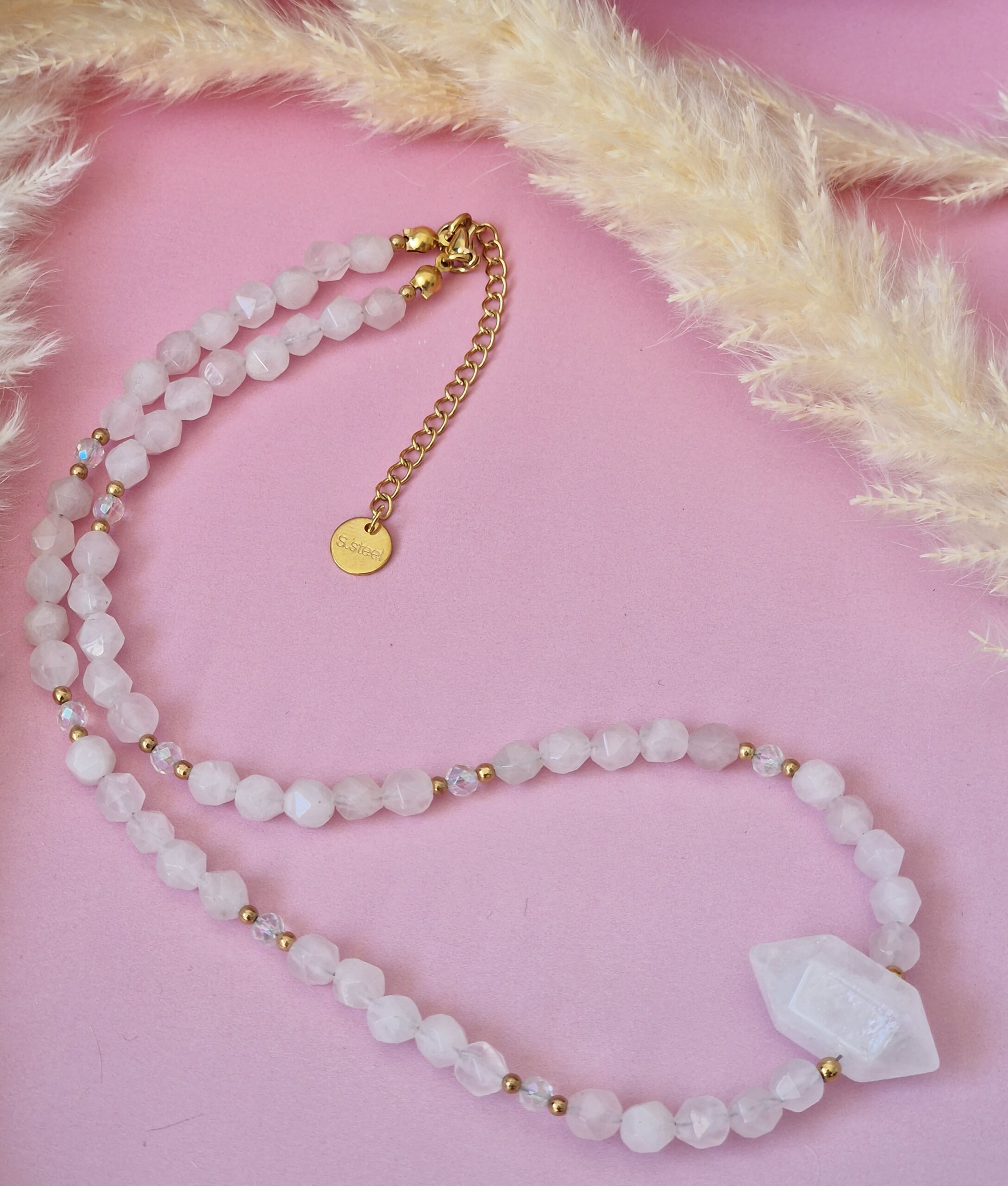 Kamienie użyte do wykonania naszyjnika : KWARC RÓŻOWY ok 6mm, KRYSZTAŁ LODOWY ok 4mm oraz HEMATYT ok 2/3mm, GROT KRYSZTAŁ GÓRSKI długość ok 26mm szerokość ok 13,5mm.