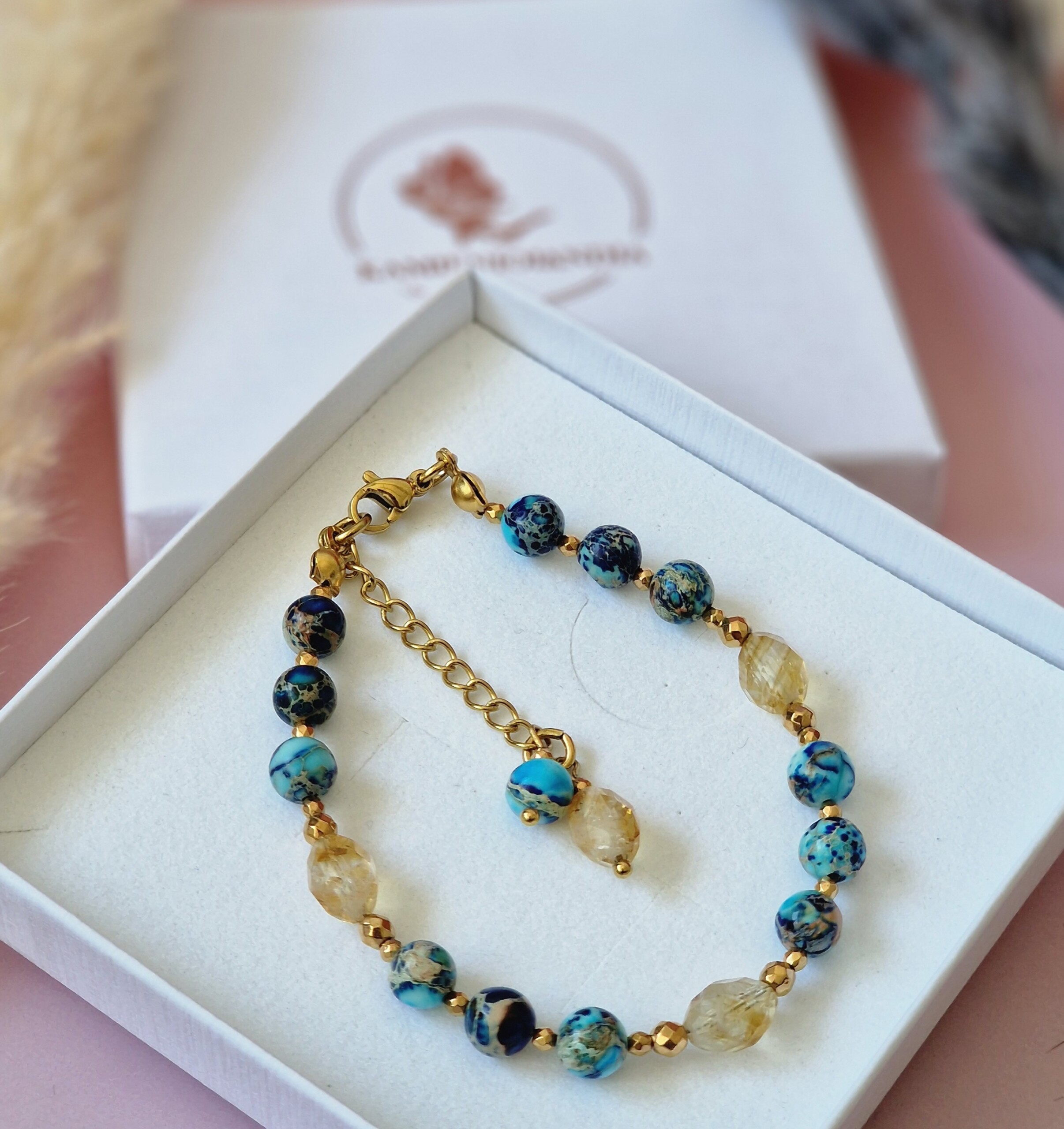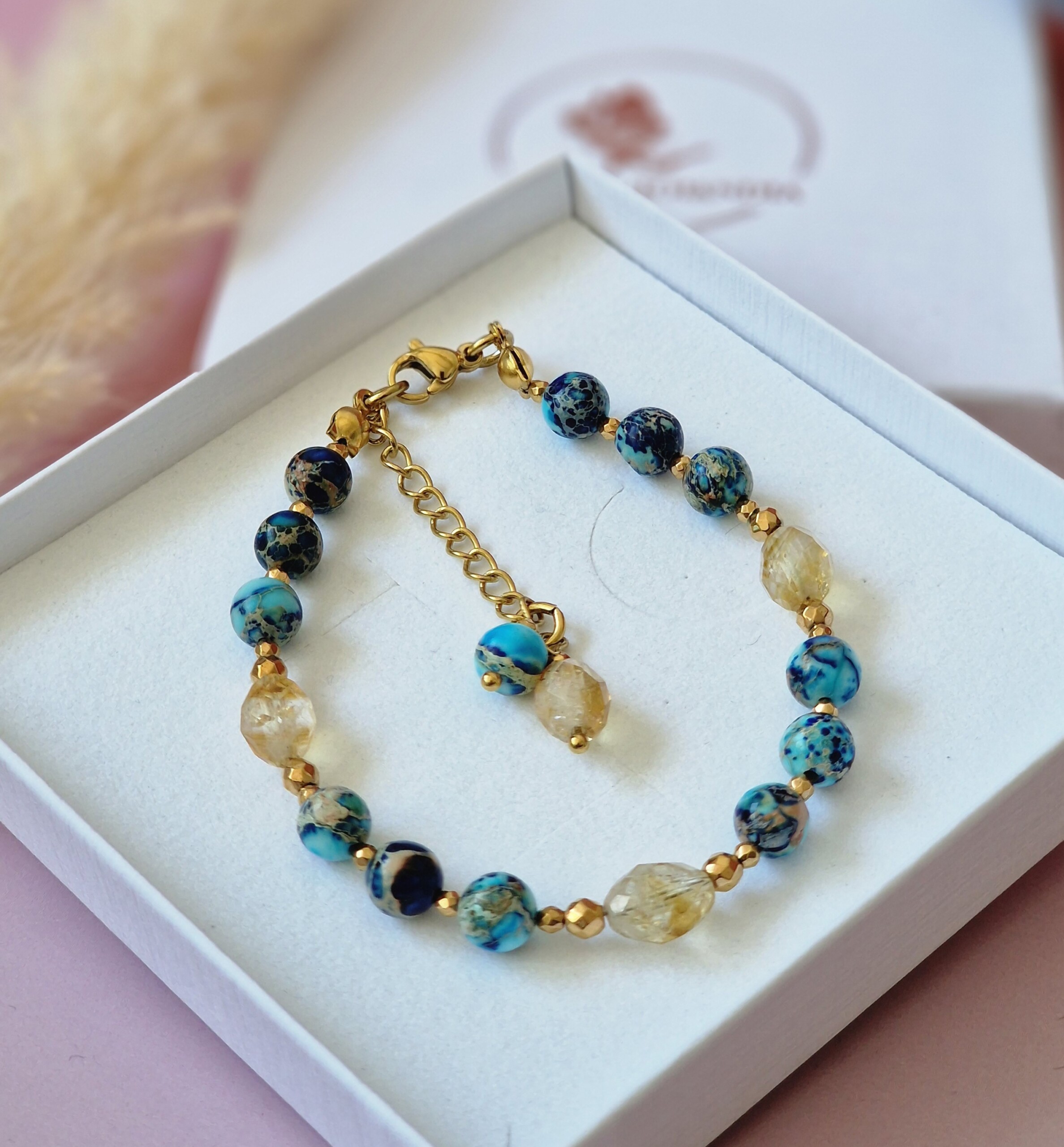 Kamienie użyte do wykonania bransoletki : CYTRYN ok 6 mm, TURKUSY Z OSADAMI MORSKIMI ok 6mm , HEMATYT ok 2 i 3mm.