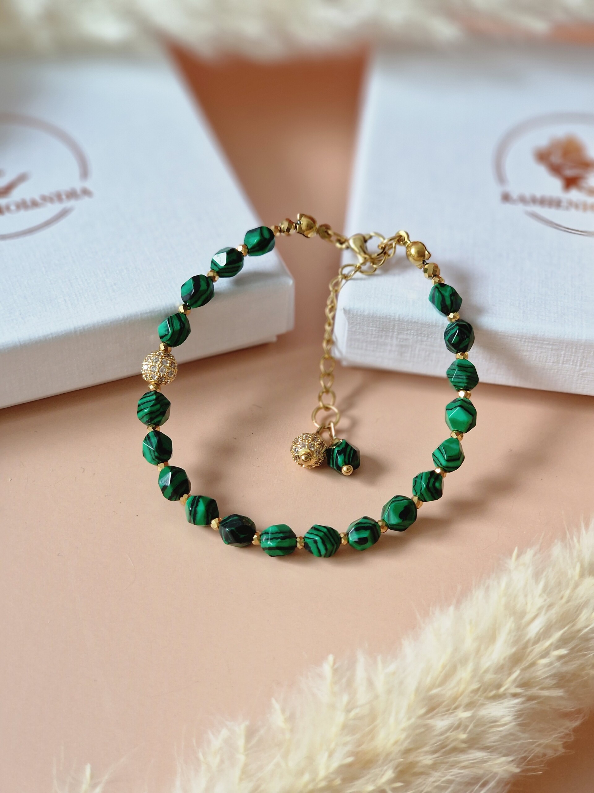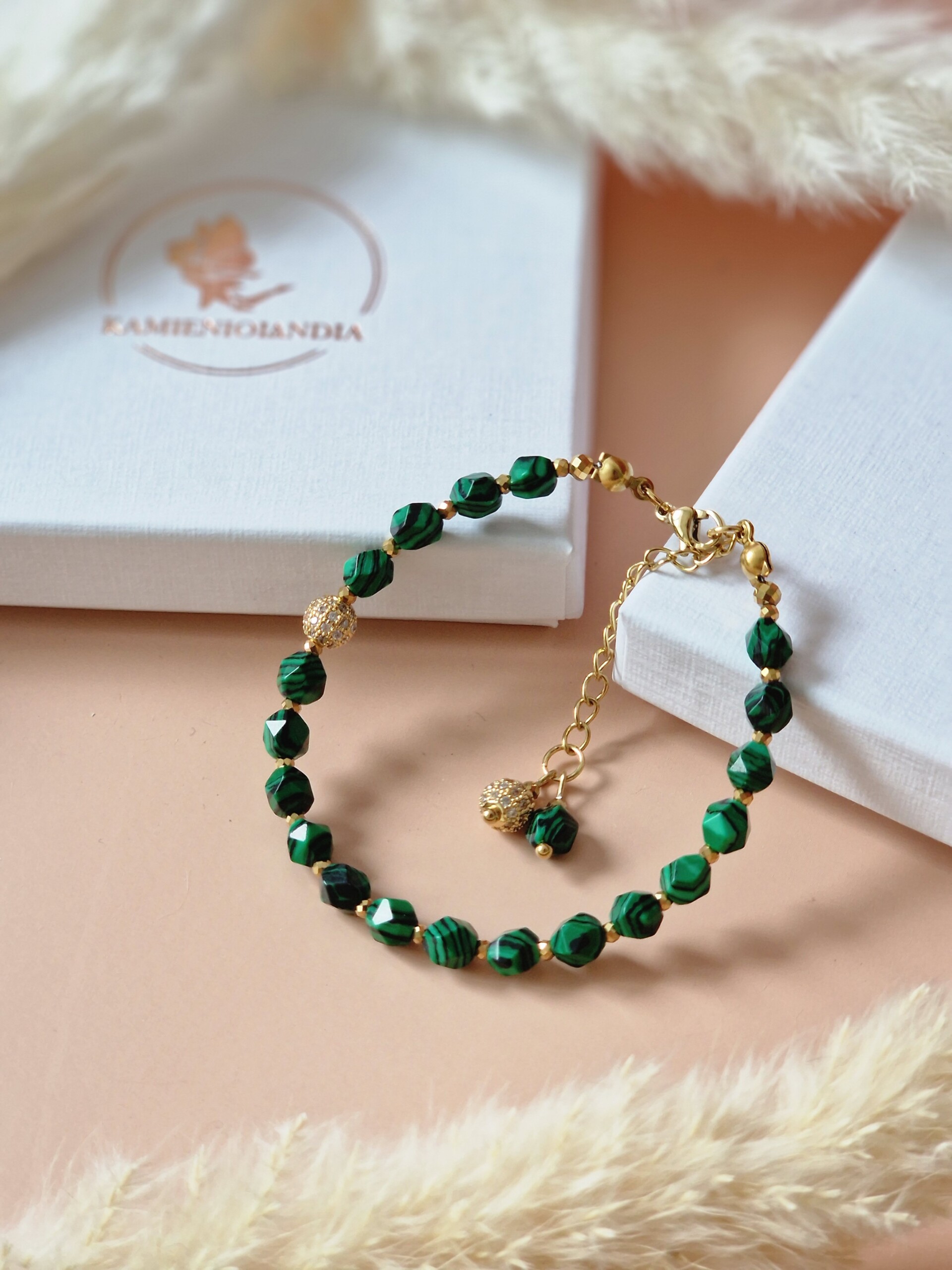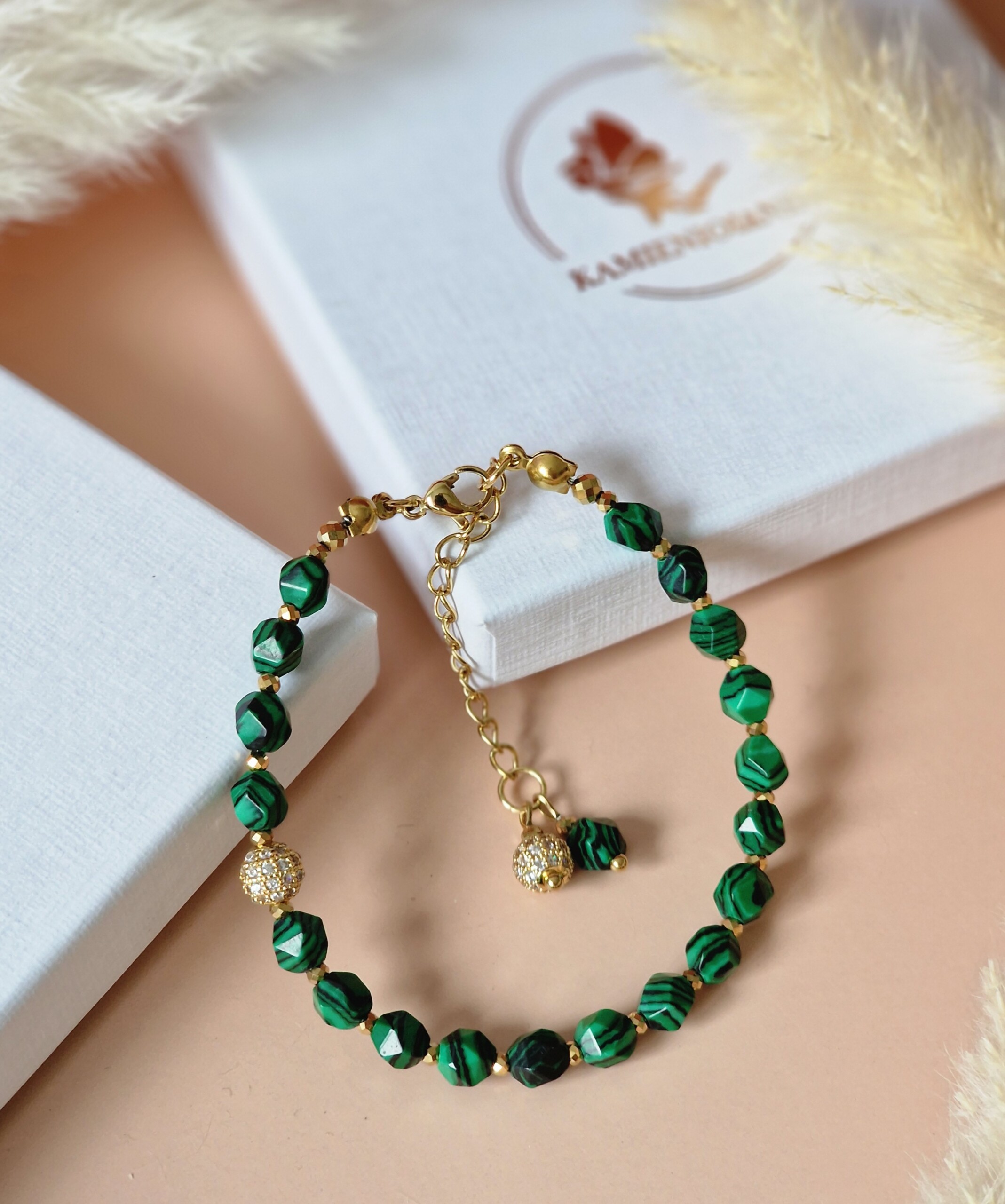 Kamienie użyte do wykonania bransoletki : MALACHIT (s) ok 6mm, HEMATYT ok 2/3mm, MIEDZIANA KULKA Z CYRKONIAMI ok 6mm.