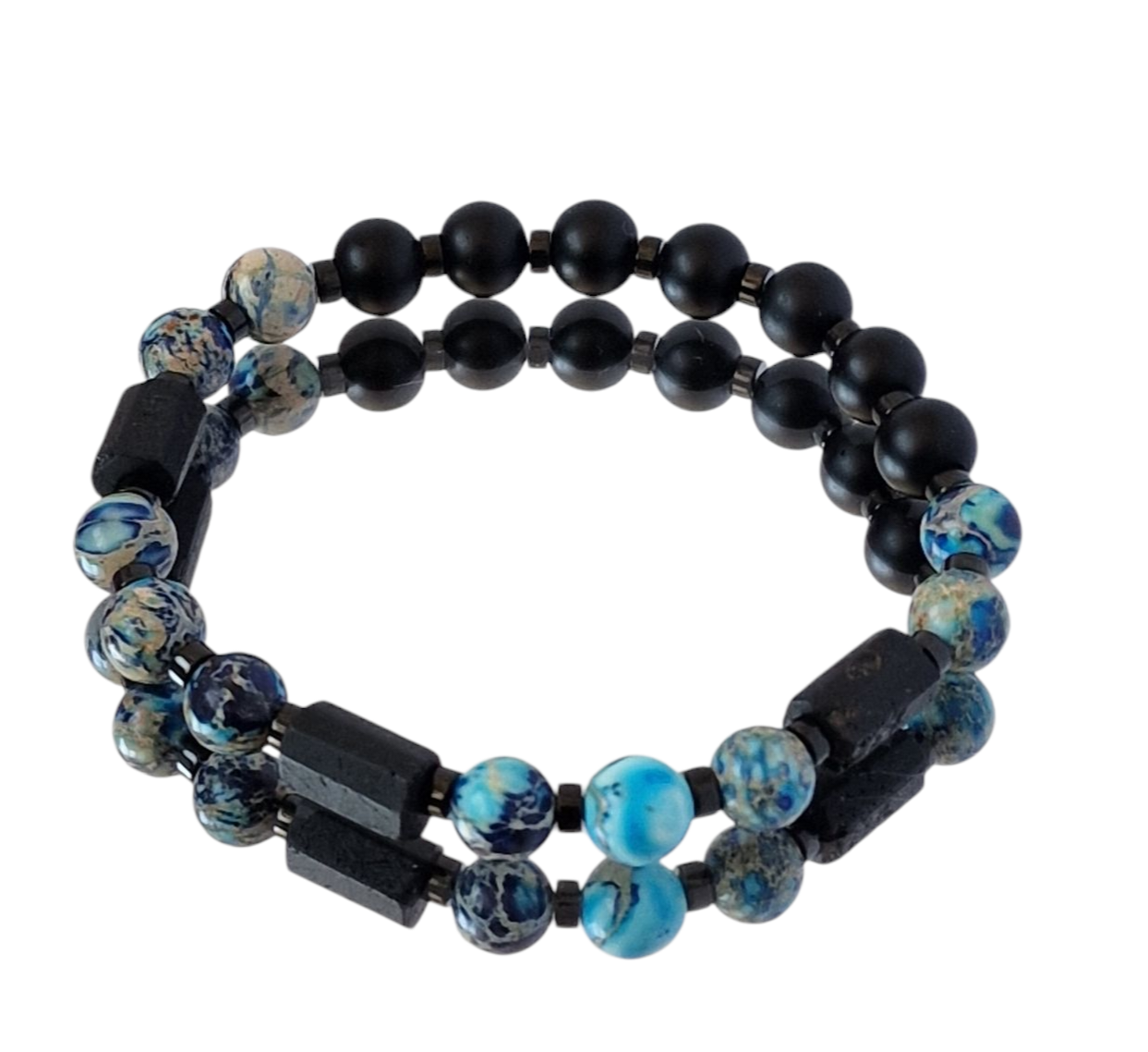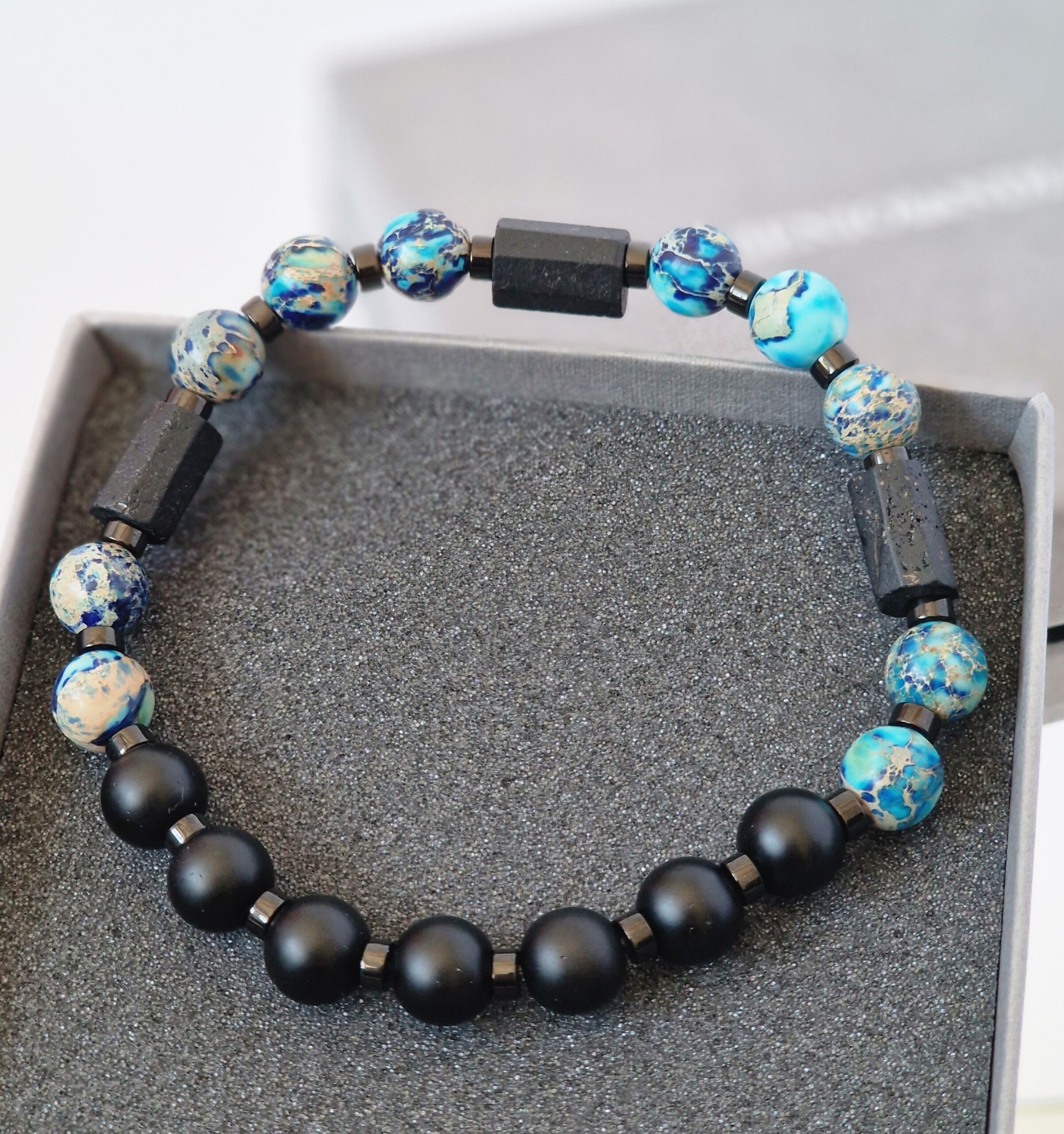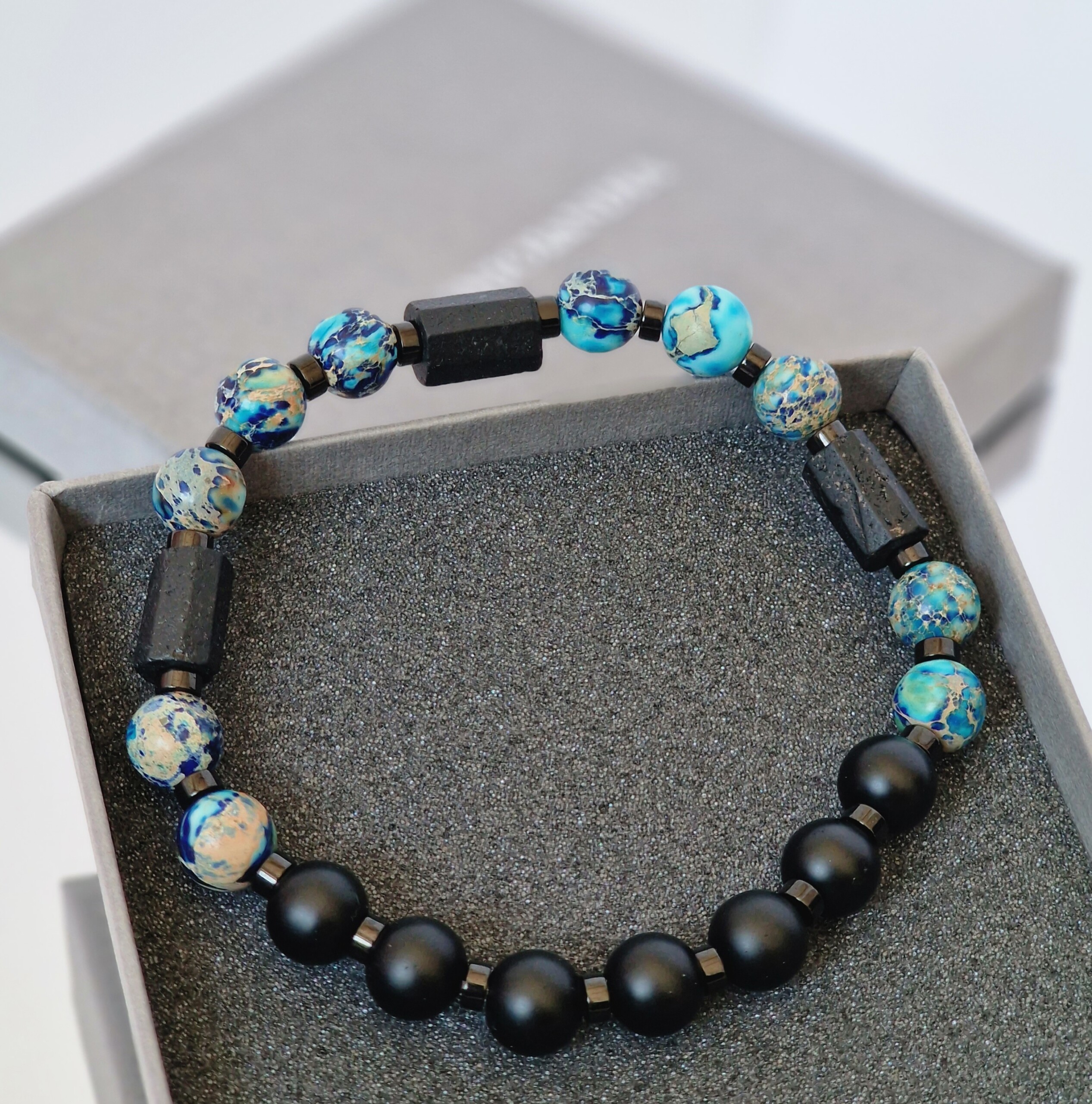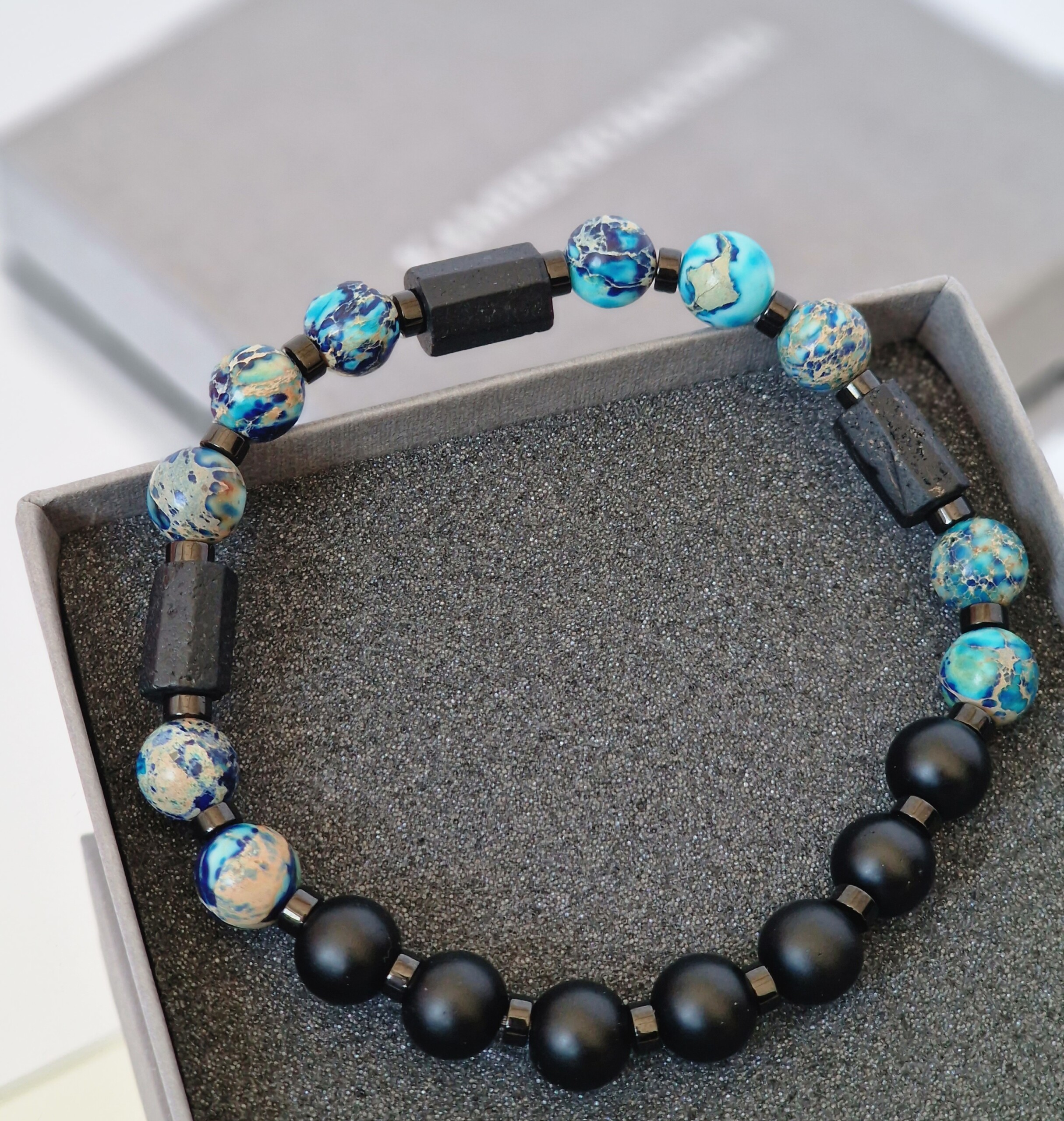 Bransoletka męska Turmalin, Turkusy z osadami morskimi, Lawa wulkaniczna, Hematyt