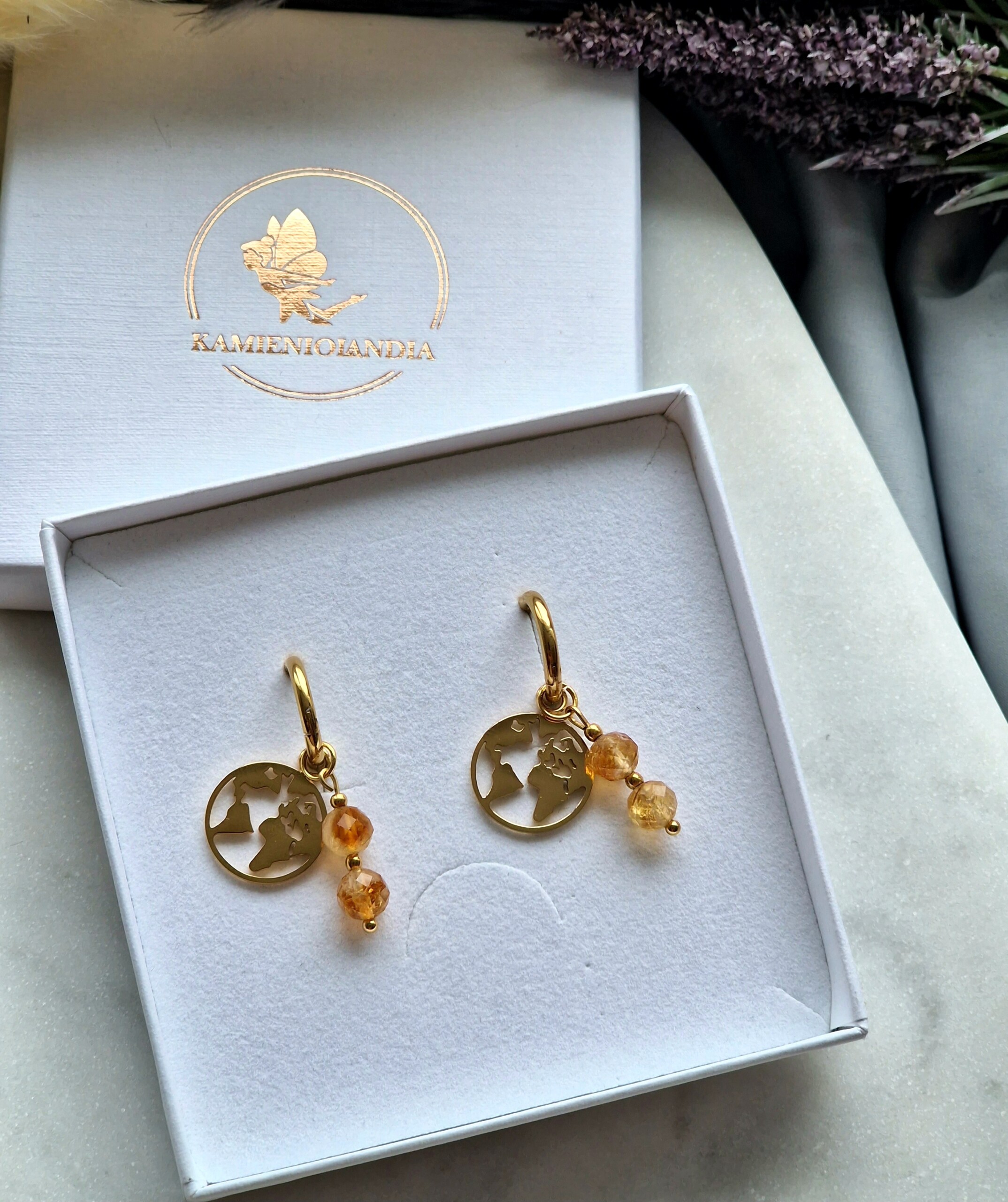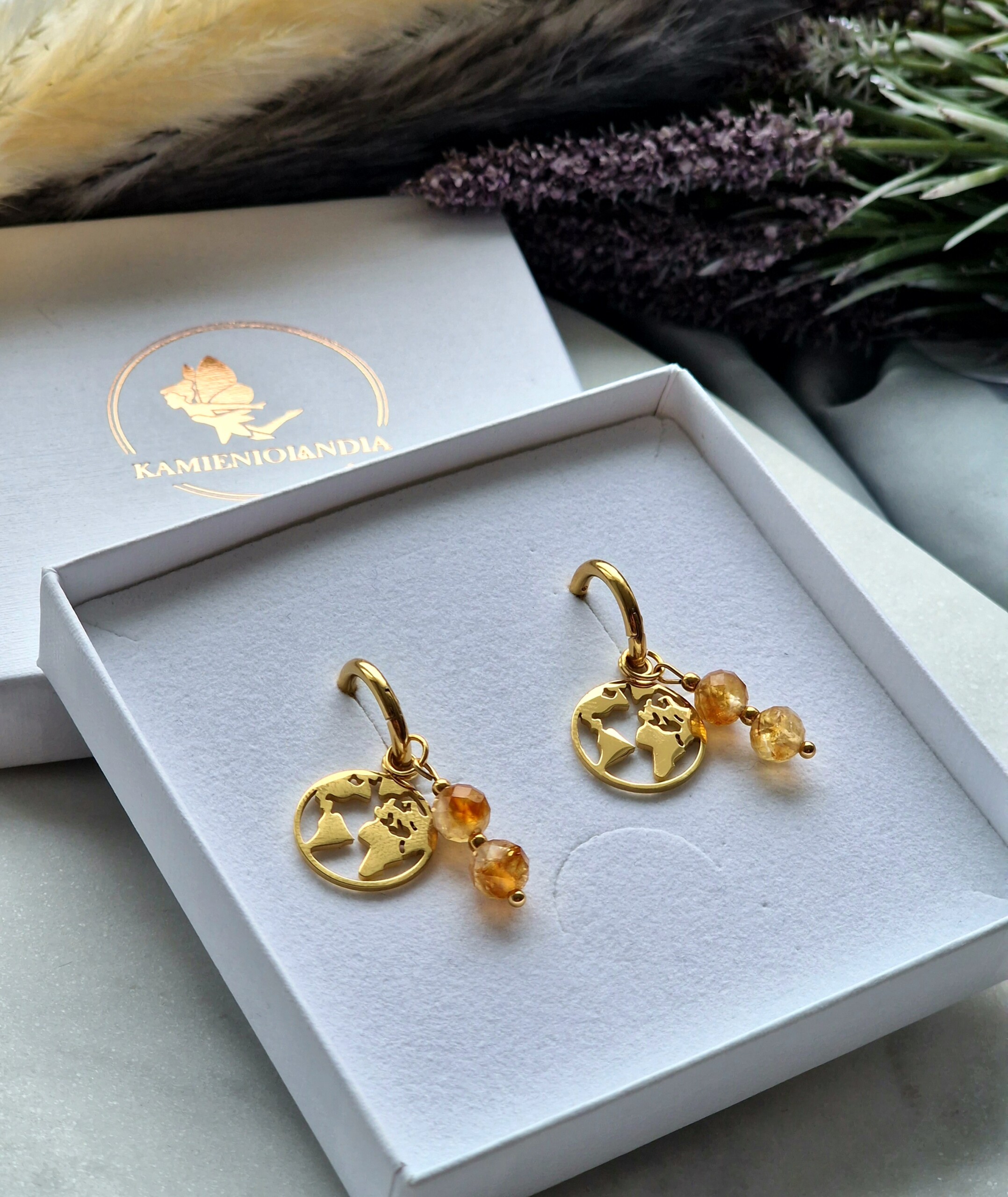 Kolczyki mapa stal nierdzewna, Cytryn, Hematyt