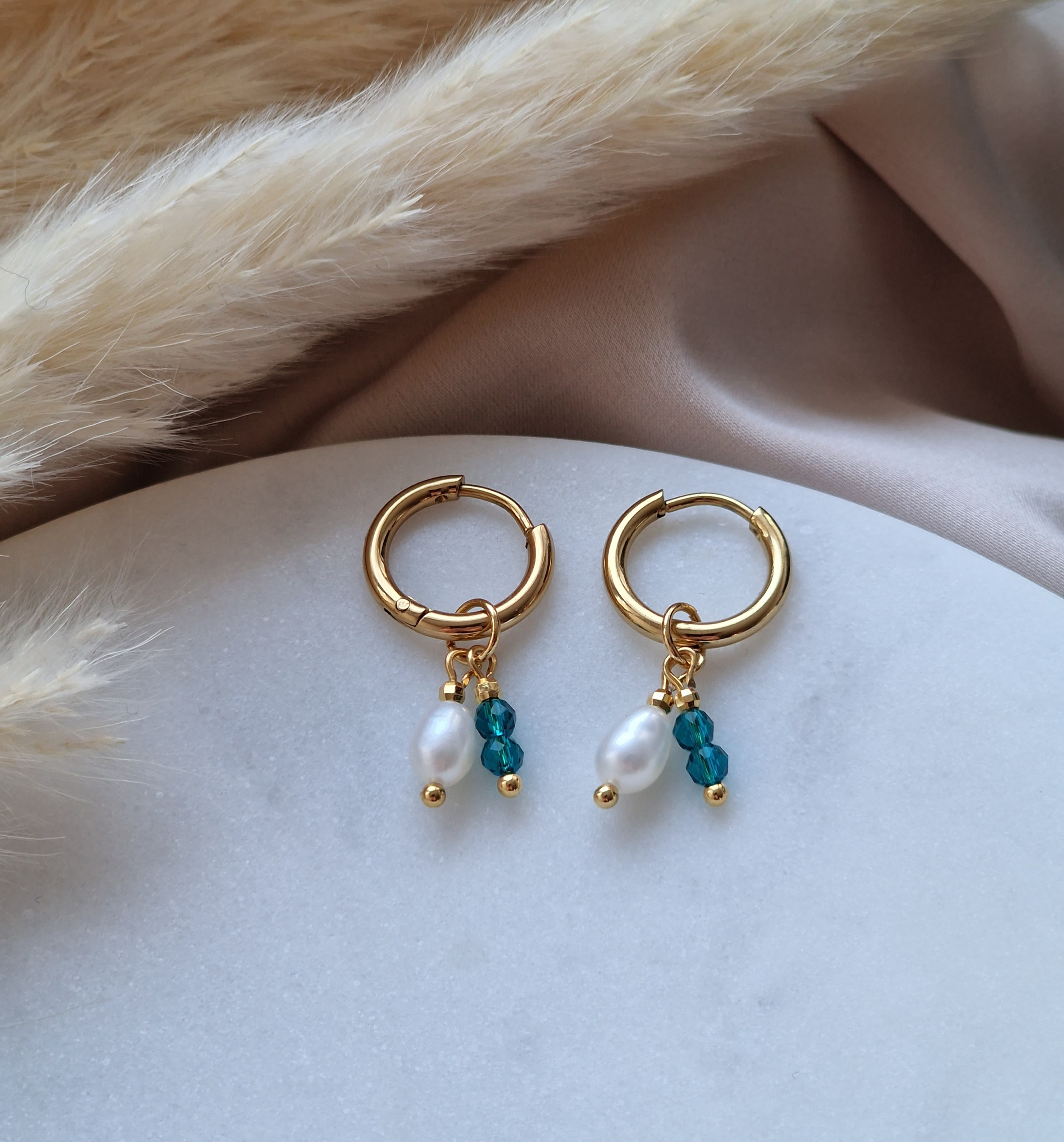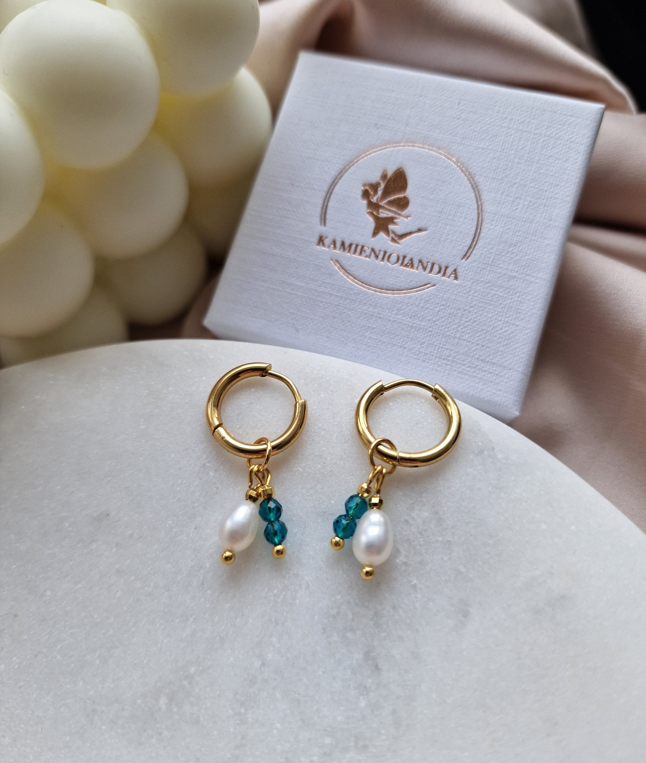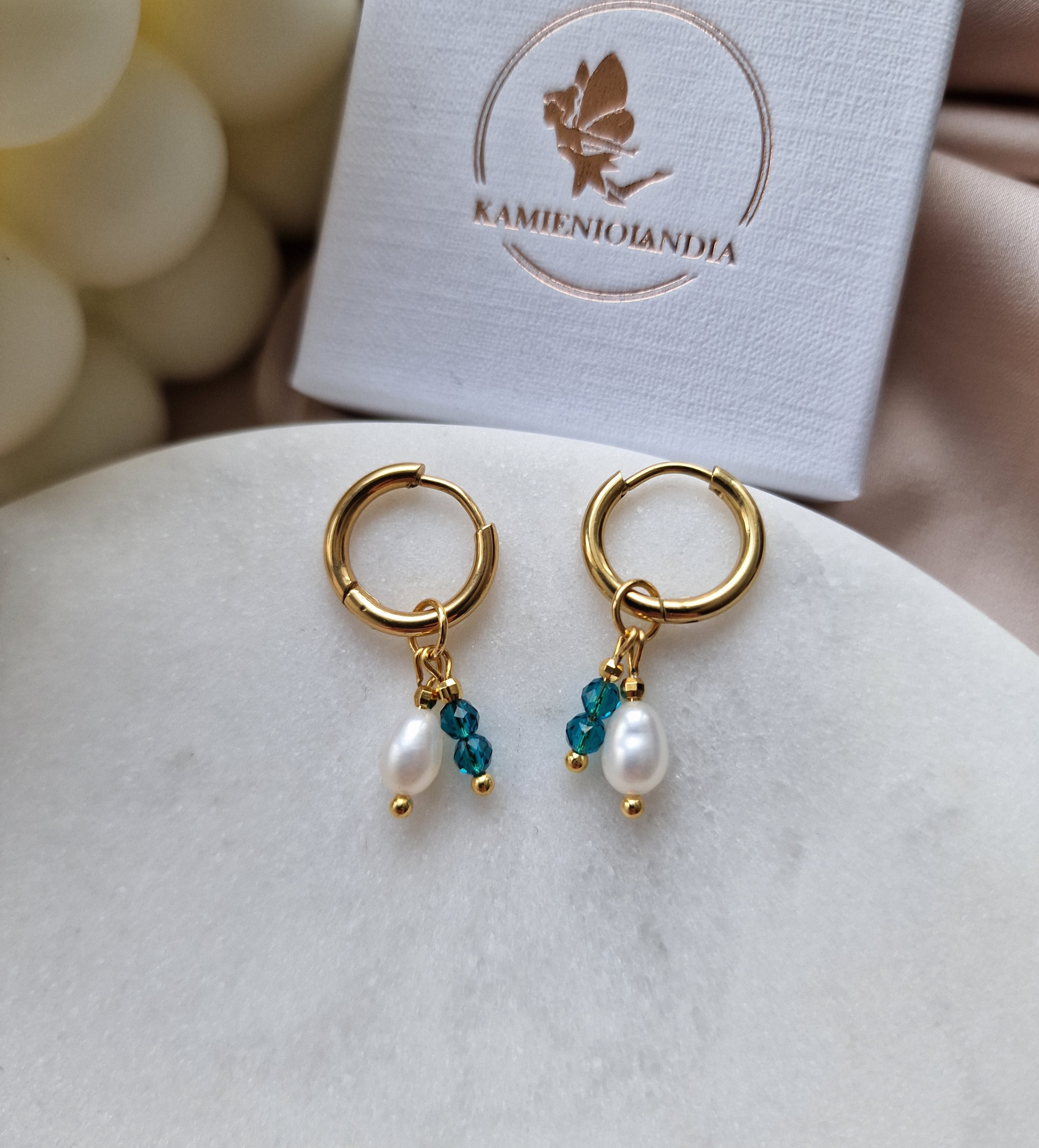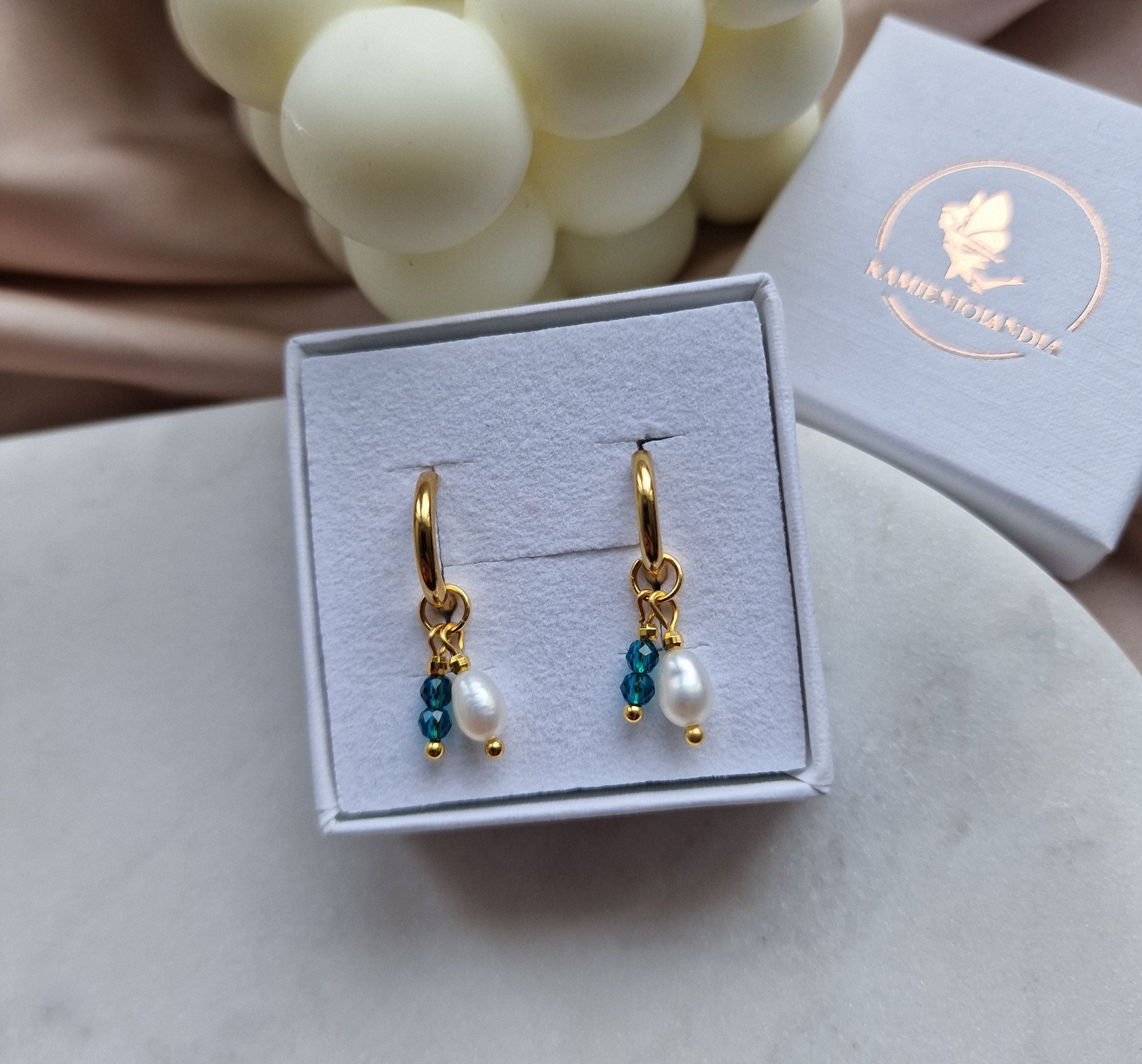 Kamienie użyte do wykonania kolczyków : PERŁA ok 3/4mm, KWARC NIEBIESKI ok 3mm oraz KULECZKI GOLD PLATED 18k ok 2mm.