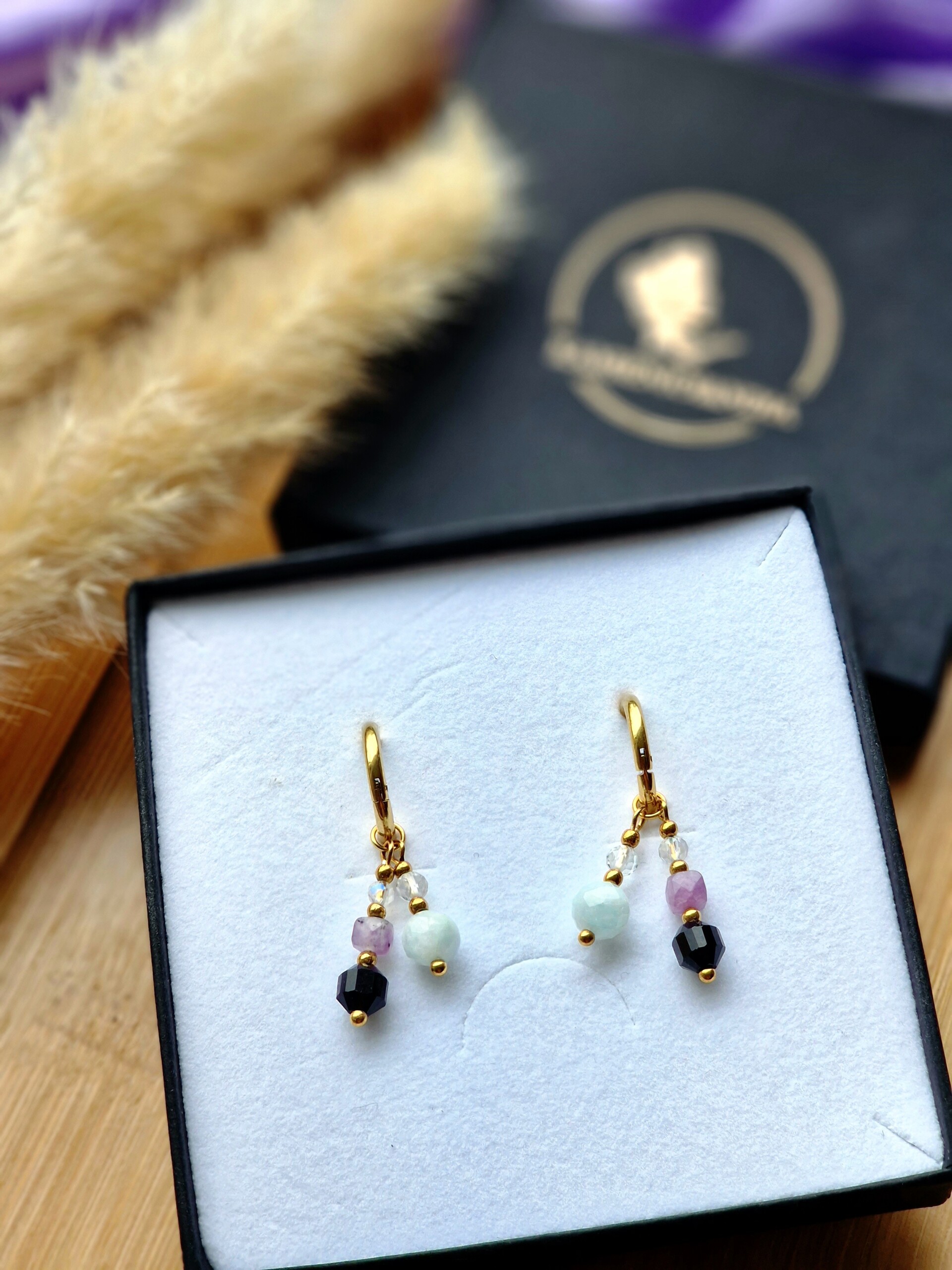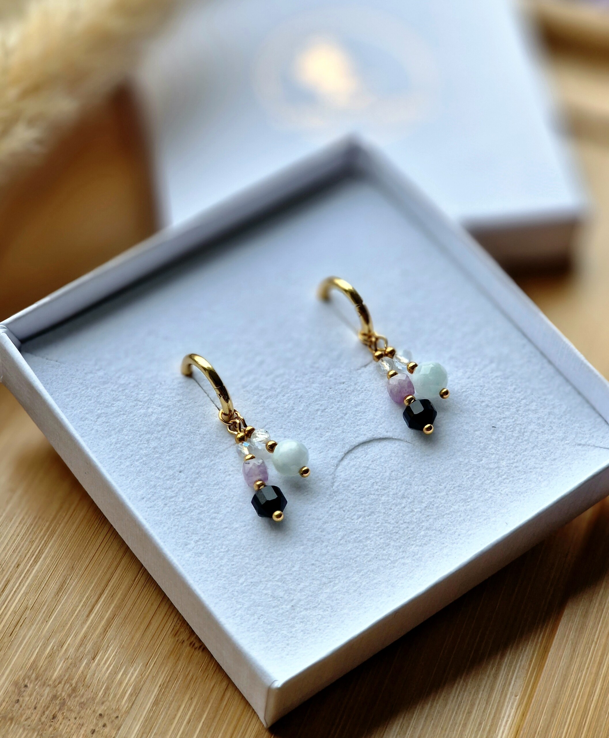 Kamienie użyte do wykonania kolczyków : TOPAZ ok 3,5 mm, AGAT ok 6mm, KRYSZTAŁ GÓRSKI ok 3mm, AMETYST ok 4,5 mm, AKWAMARYN ok 6mm, HEMATYT ok 2mm.