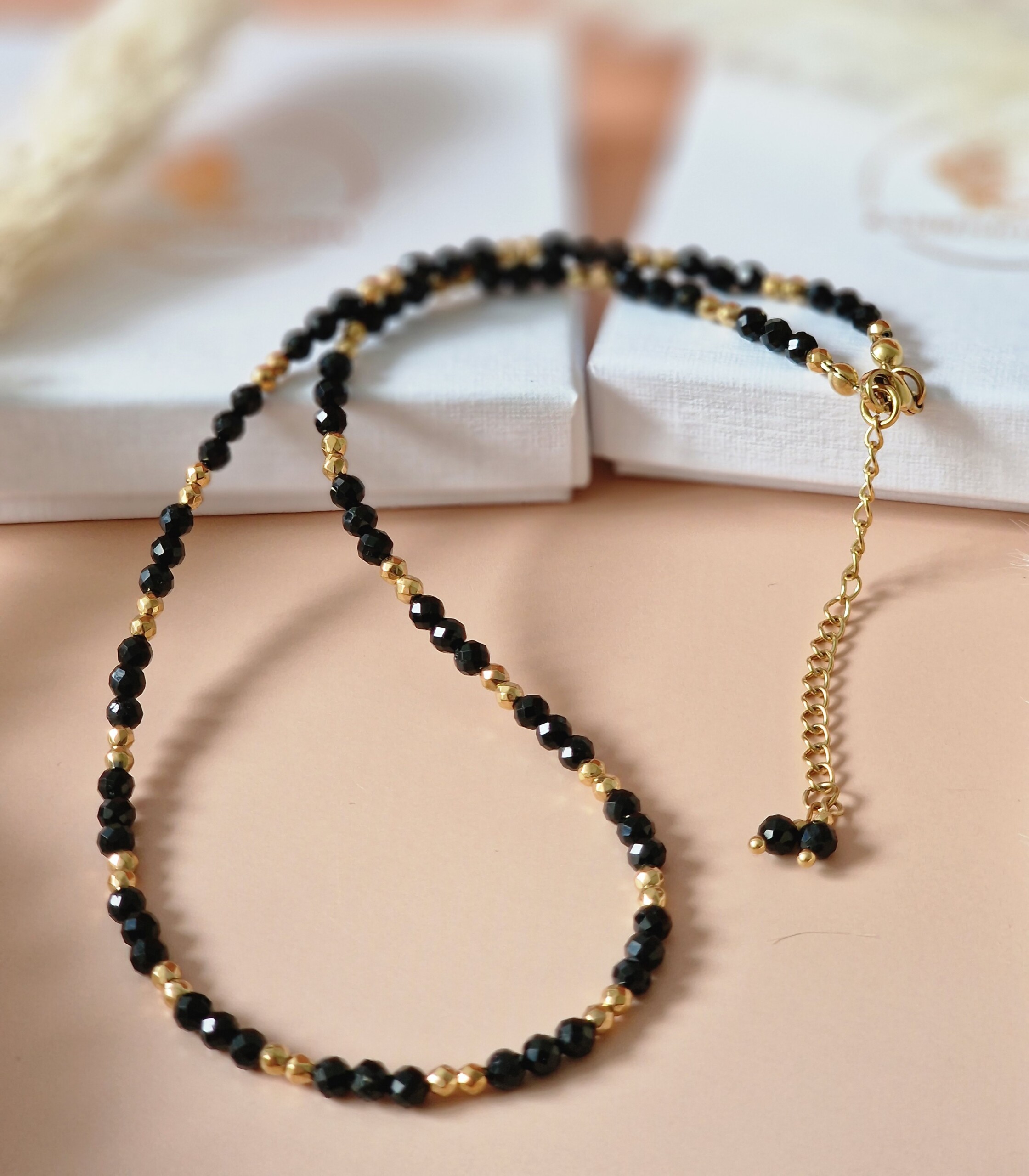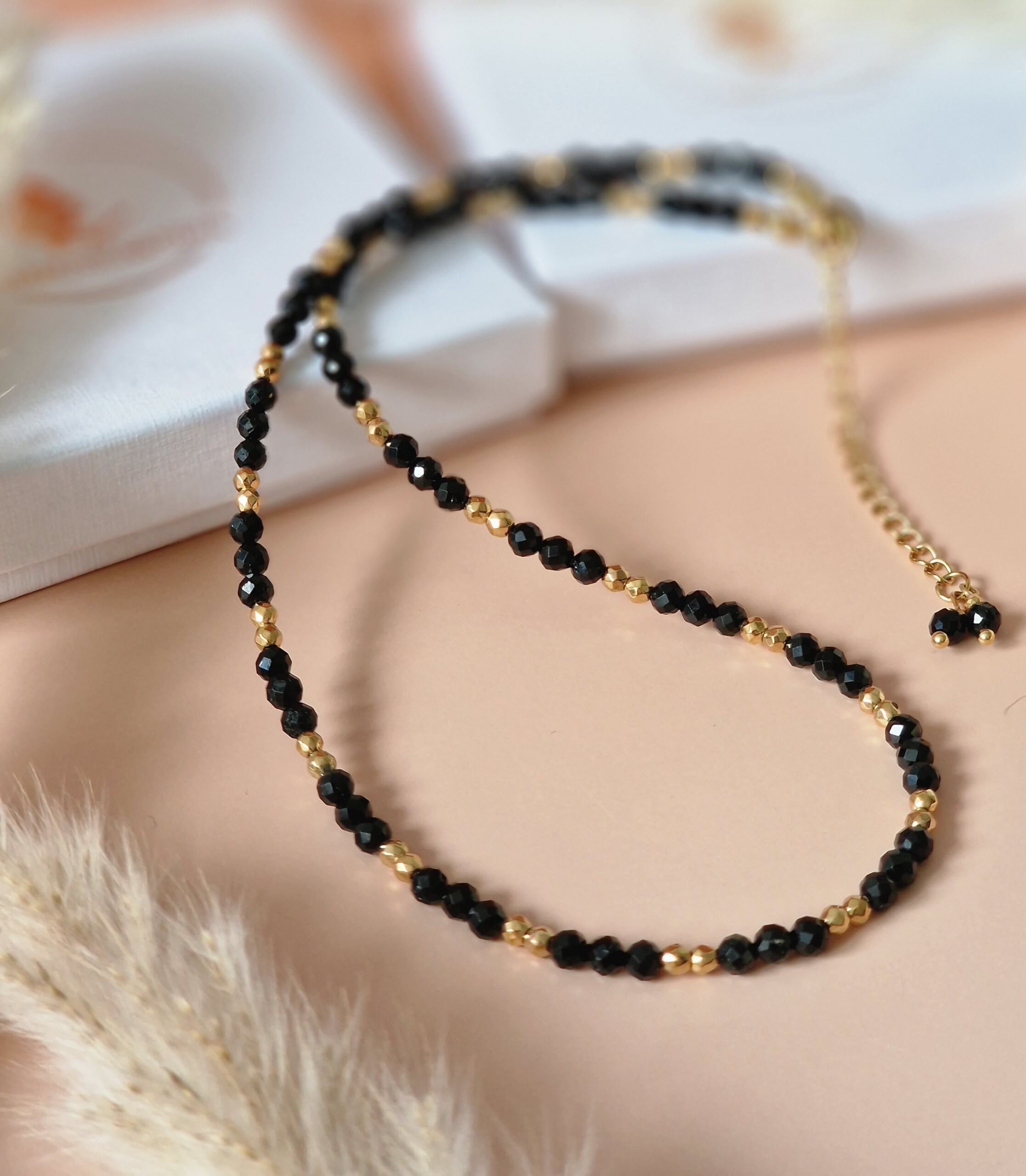 Kamienie użyte do wykonania naszyjnika :  TURMALIN  ok 4 mm  HEMATYT  ok 3mm.
